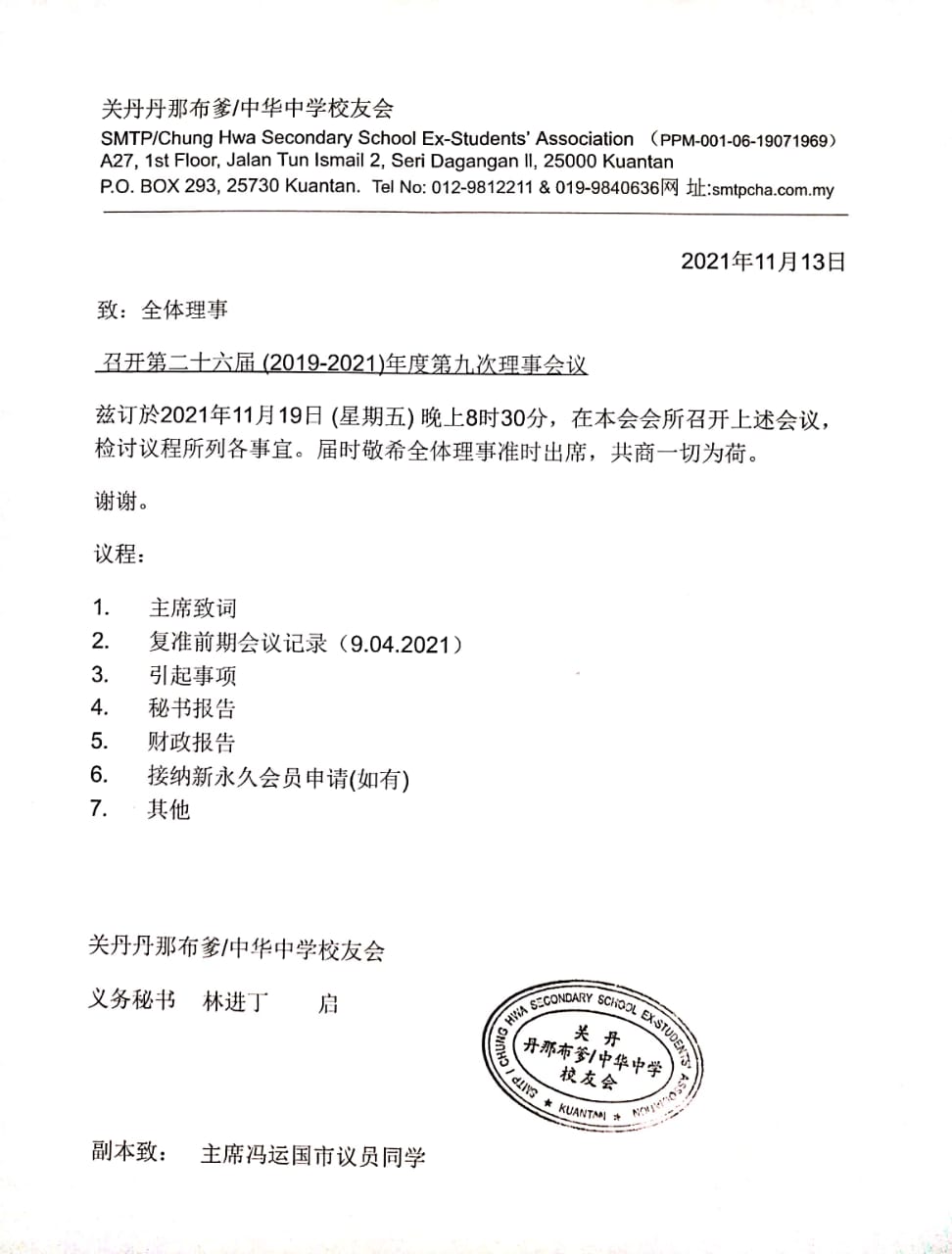 关丹丹那布爹/中华中学校友会第二十六届 (2019-2021)年度第九次理事会议兹订於2021年11月19日 (星期五) 晚上8时30分。