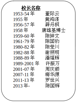 从1952年两校合并而成的 “中国华侨中小学校" 开始,第一任校长为陈玉堂,惟陈氏在任仅一年便因故辞职,改由董际云接任校长职。